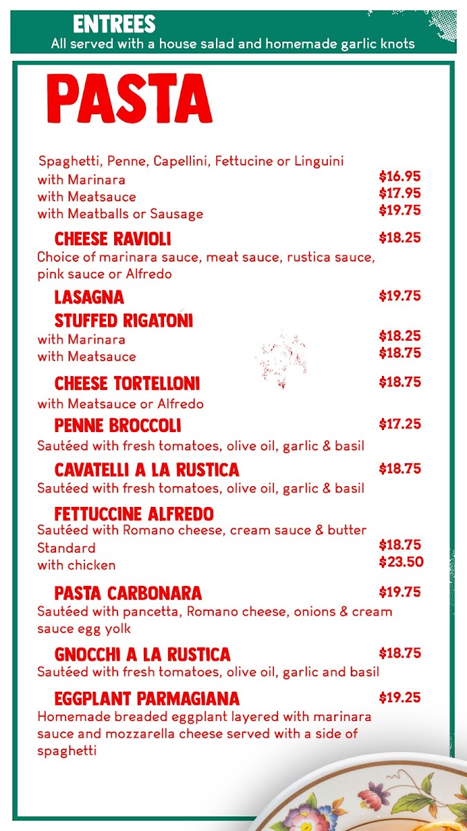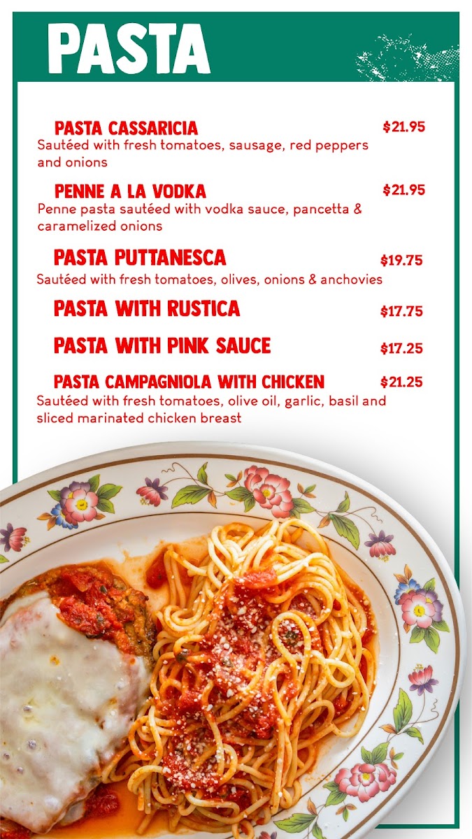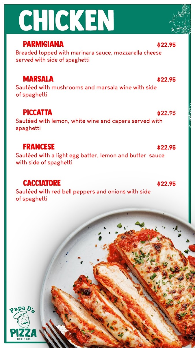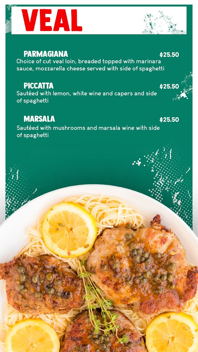 Their Chicken dishes are another highlight, with mouthwatering choices like Chicken Parmigiana, Chicken Piccatta, and Chicken Marsala. If you're in the mood for something tangy, try the Chicken Cacciatore or Chicken Francese.