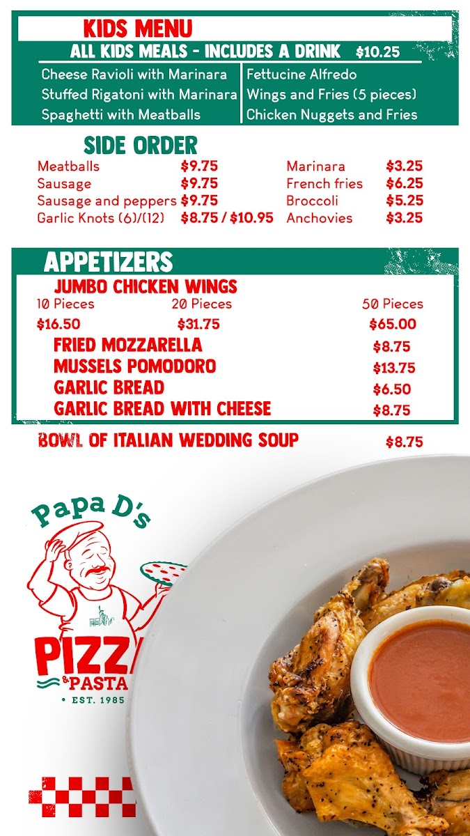 Papa D Pizza also caters to younger guests with its Kids Menu, offering choices like Cheese Ravioli with Marinara, Wings and Fries (5 Pcs), and Spaghetti with Meatballs. The Chicken Nuggets and Fries and Fettuccine Alfredo are other great options for kids.