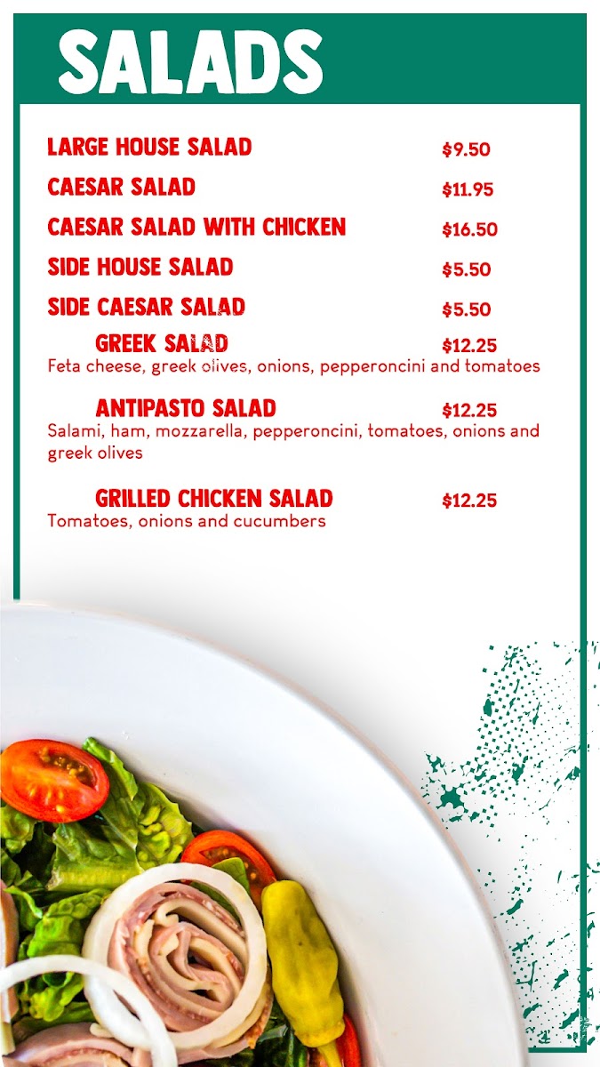 The Salads menu features both large and side options, such as the Large Caesar Salad and Large House Salad. For a bit of protein, the Grilled Chicken Salad and Caesar Salad with Chicken are perfect.